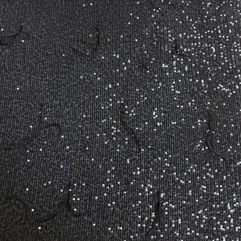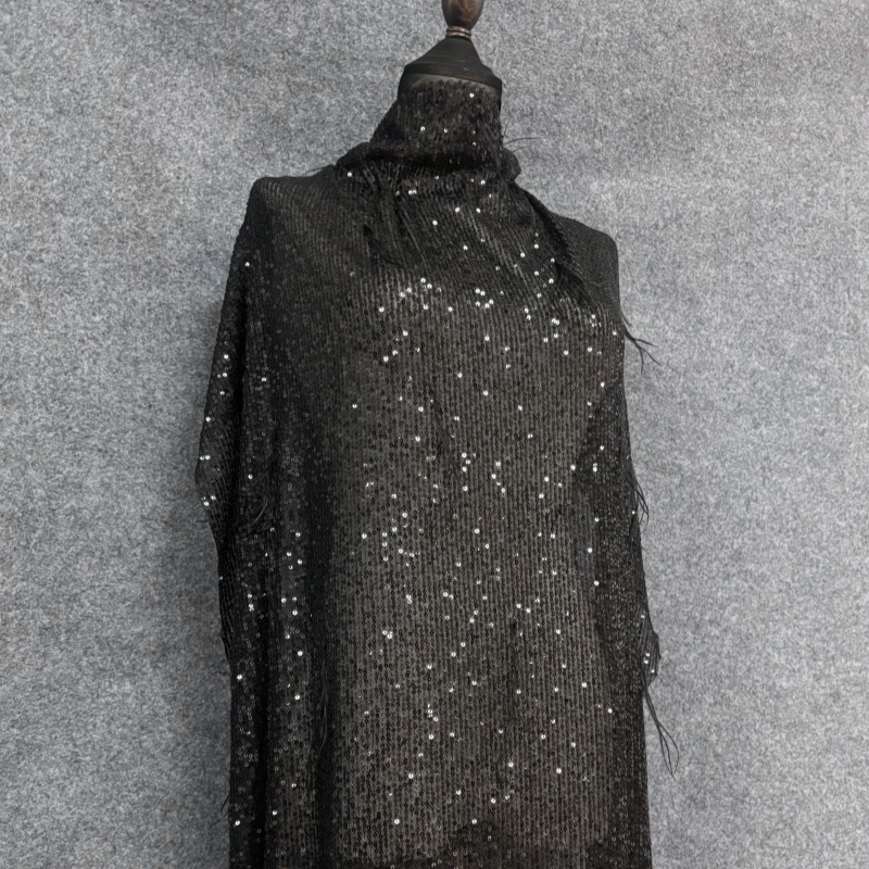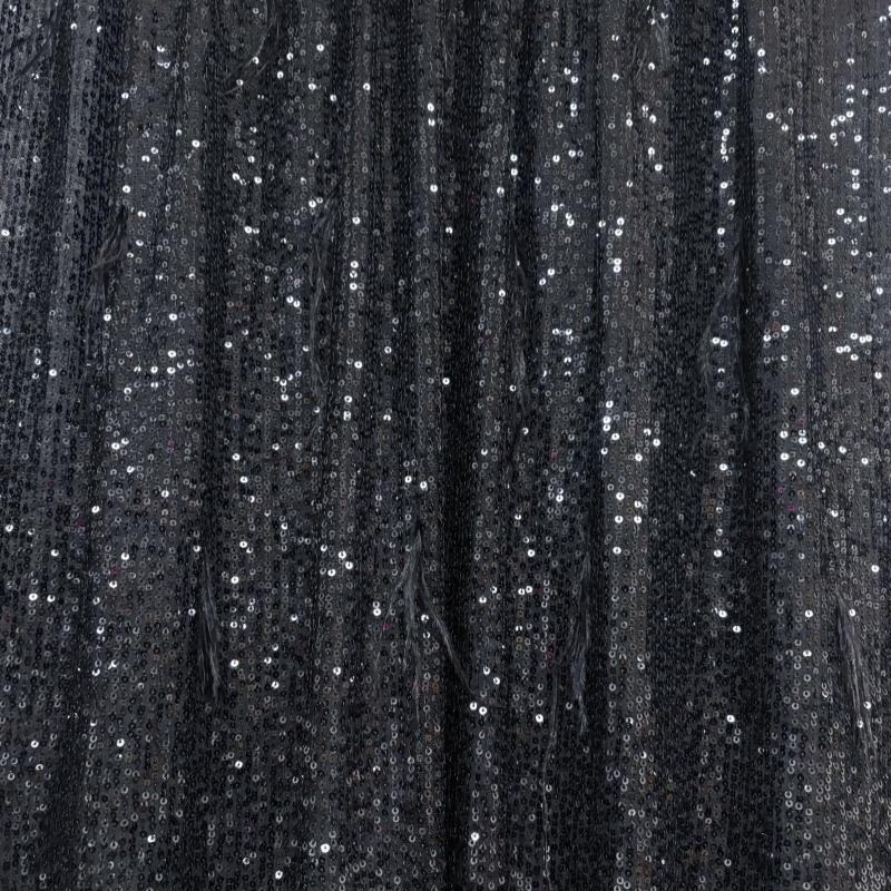 To add further dimension, the fabric is accented with randomly distributed black tassels made from soft, silky threads. These tassels introduce movement and texture, gently swaying with motion and contrasting beautifully with the structured sequin lines. The combination of shimmering metallic details and fluid fringe creates a sophisticated yet playful visual rhythm.