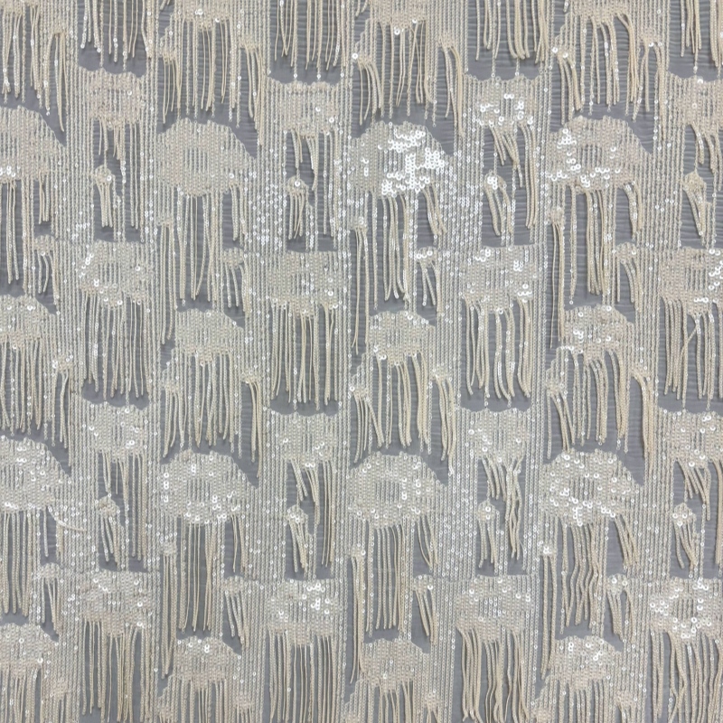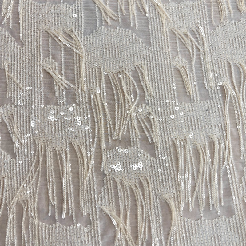 Featuring a soft creamy white tone, the fabric offers a refined and sophisticated look, while the layered sequin embroidery and fringe elements create a fluid, light-catching surface. The result is a textile that feels both modern and timeless—perfect for fashion pieces that demand attention.
