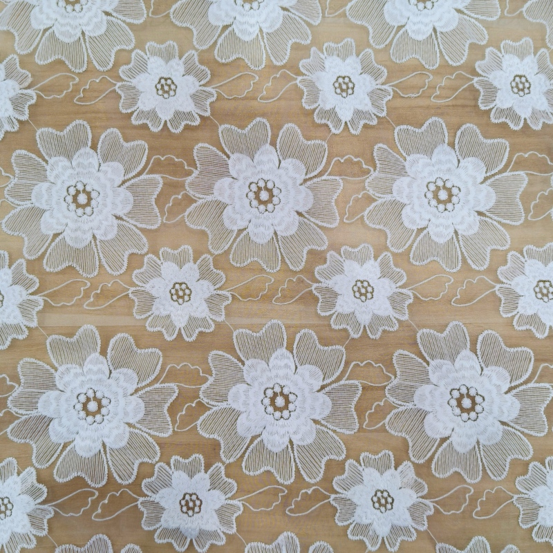 This lace showcases oversized floral motifs placed within a clean grid layout, combining:
