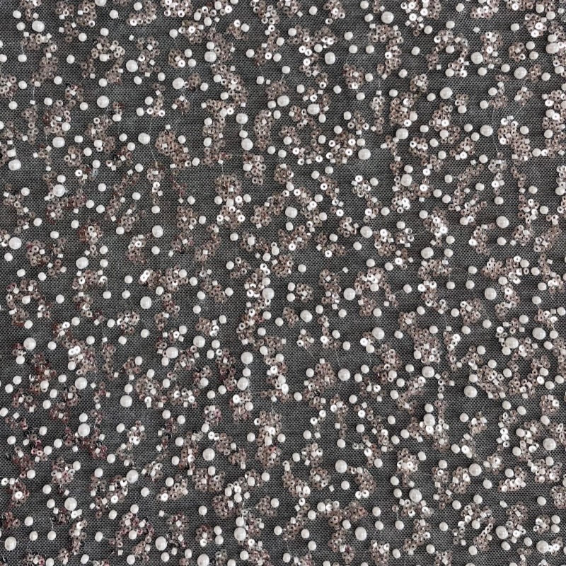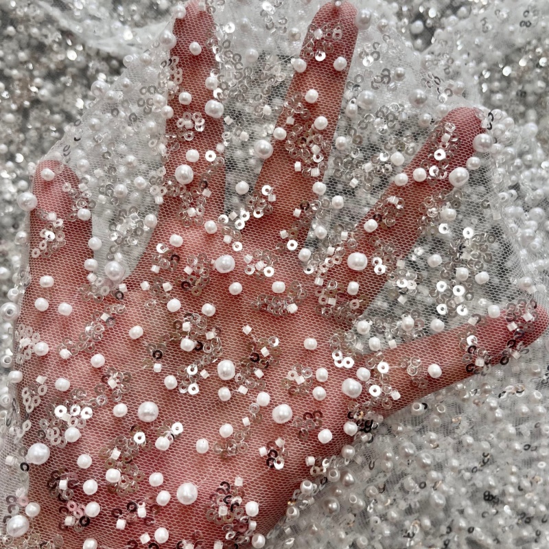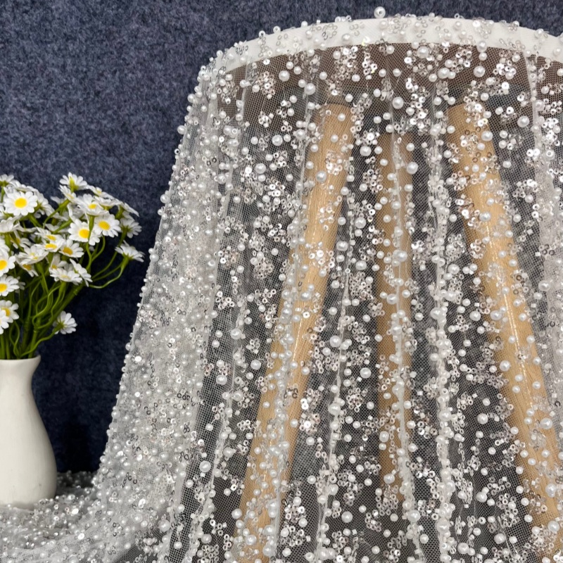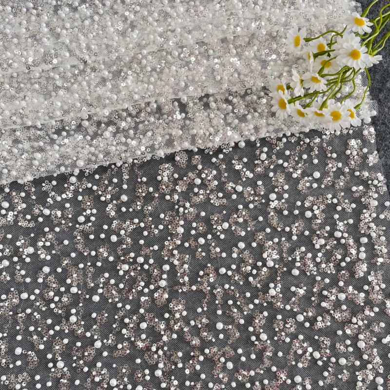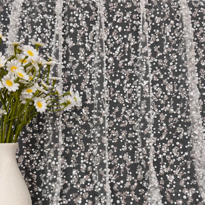 It is a mesh-based fabric decorated with pearls, sequins, and beads, creating a rich three-dimensional and luxurious surface.