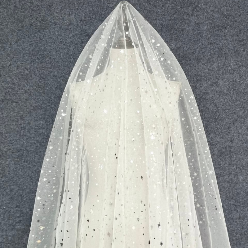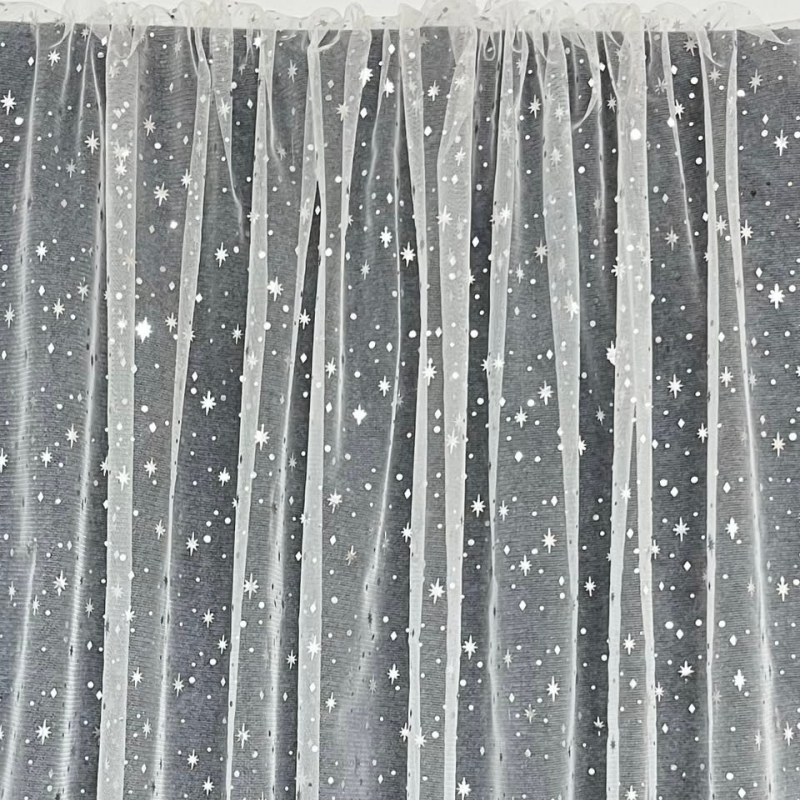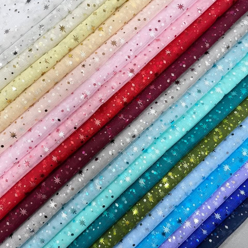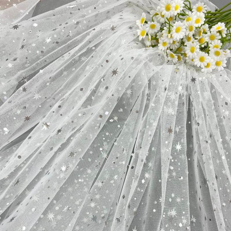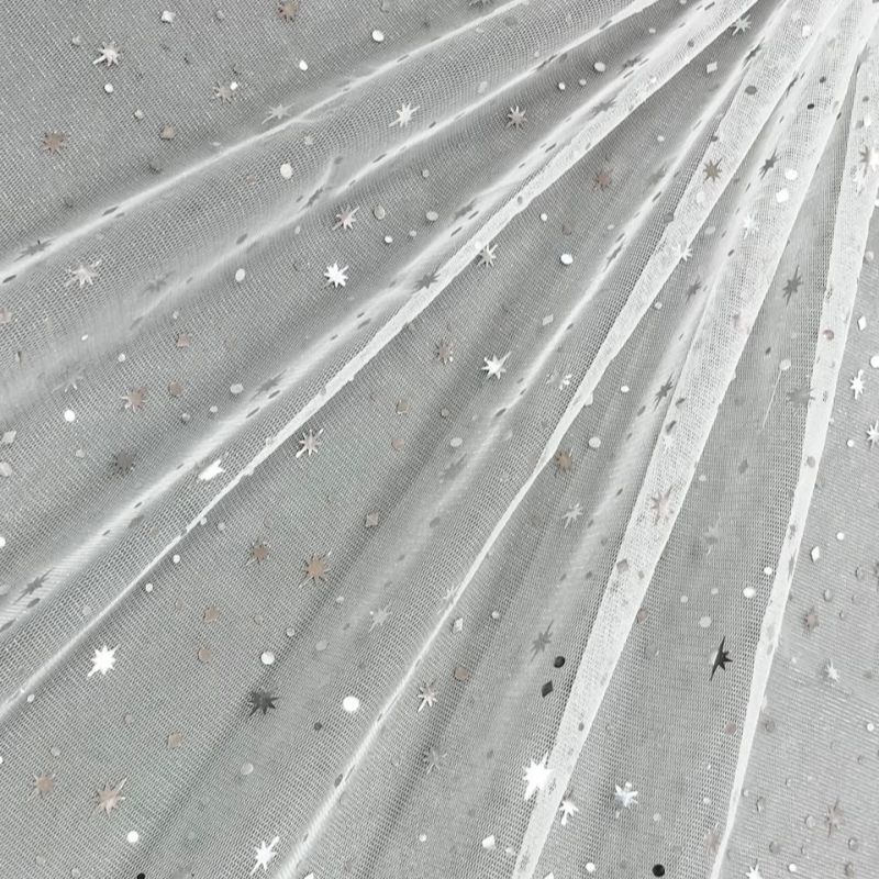 Featuring sparkling star and moon sequins scattered across soft tulle, this fabric delivers a dreamy “galaxy-inspired” effect that instantly elevates any design with a sense of wonder and celebration.