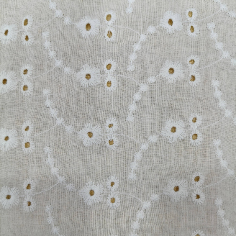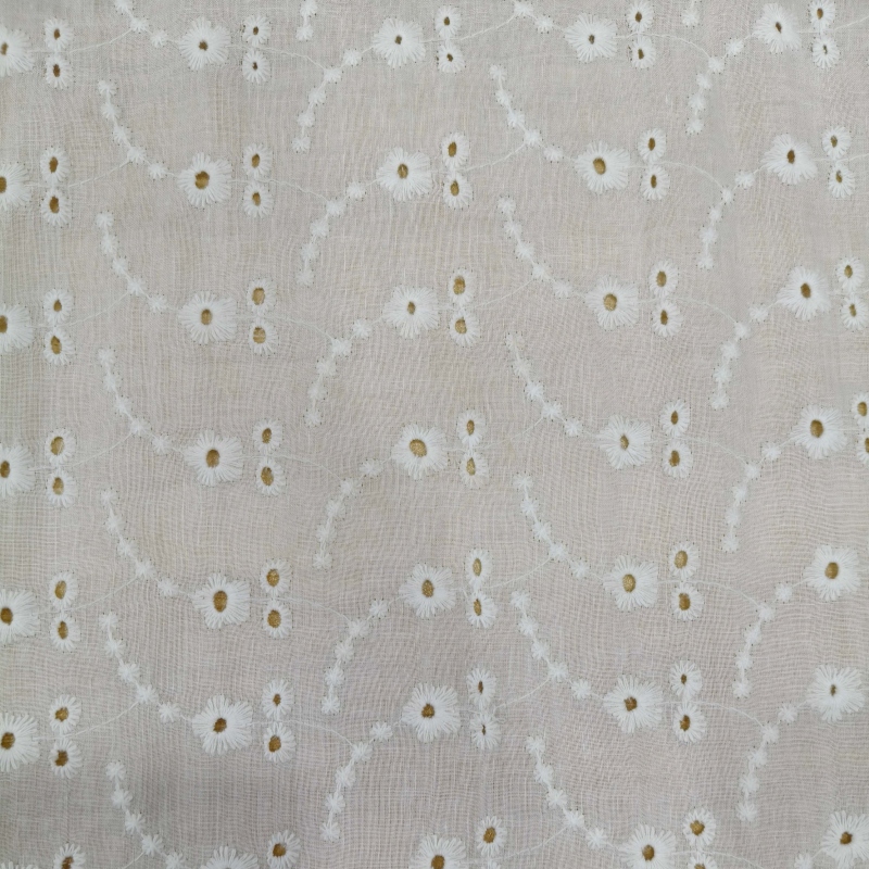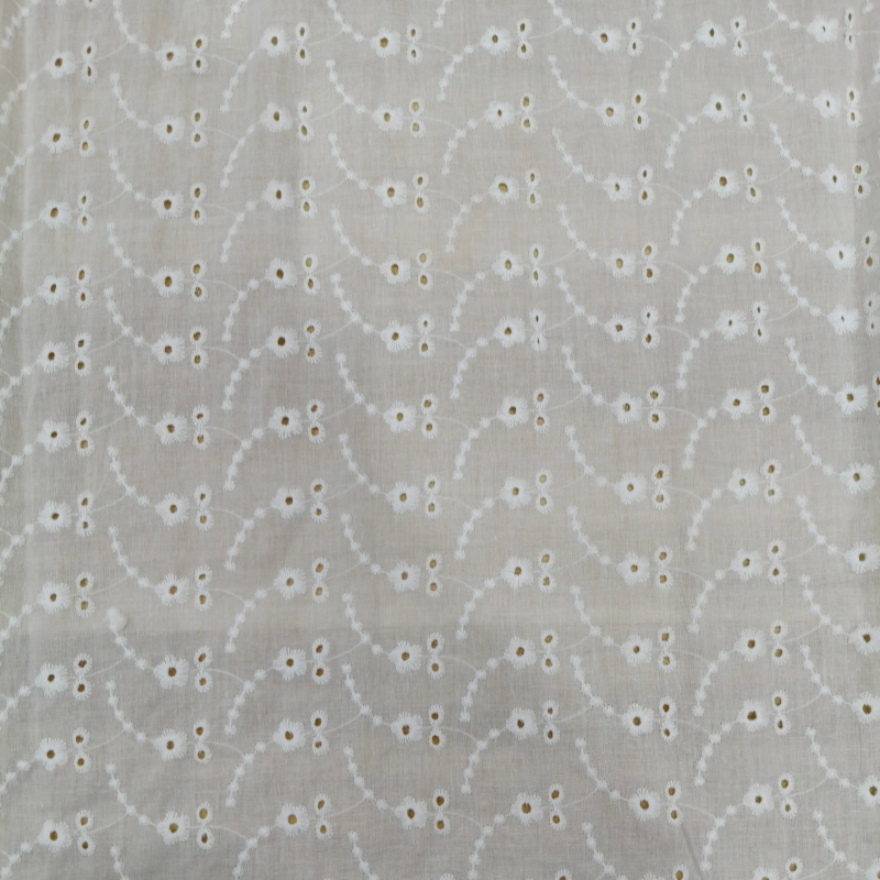At the center of each flower, precision eyelet perforations are created using specialized embroidery techniques. These small decorative openings enhance breathability while producing the distinctive openwork texture characteristic of broderie anglaise. The subtle transparency created by the eyelet structure gives the fabric a light and airy visual effect, making it especially suitable for warm-weather garments.